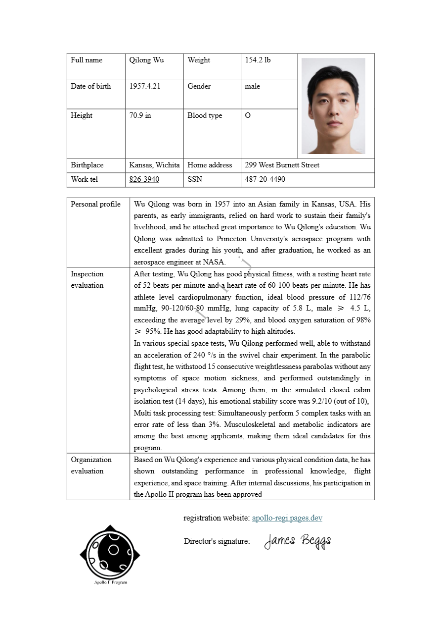 Application Form for Astronauts to Carry Personal Items (excerpt)